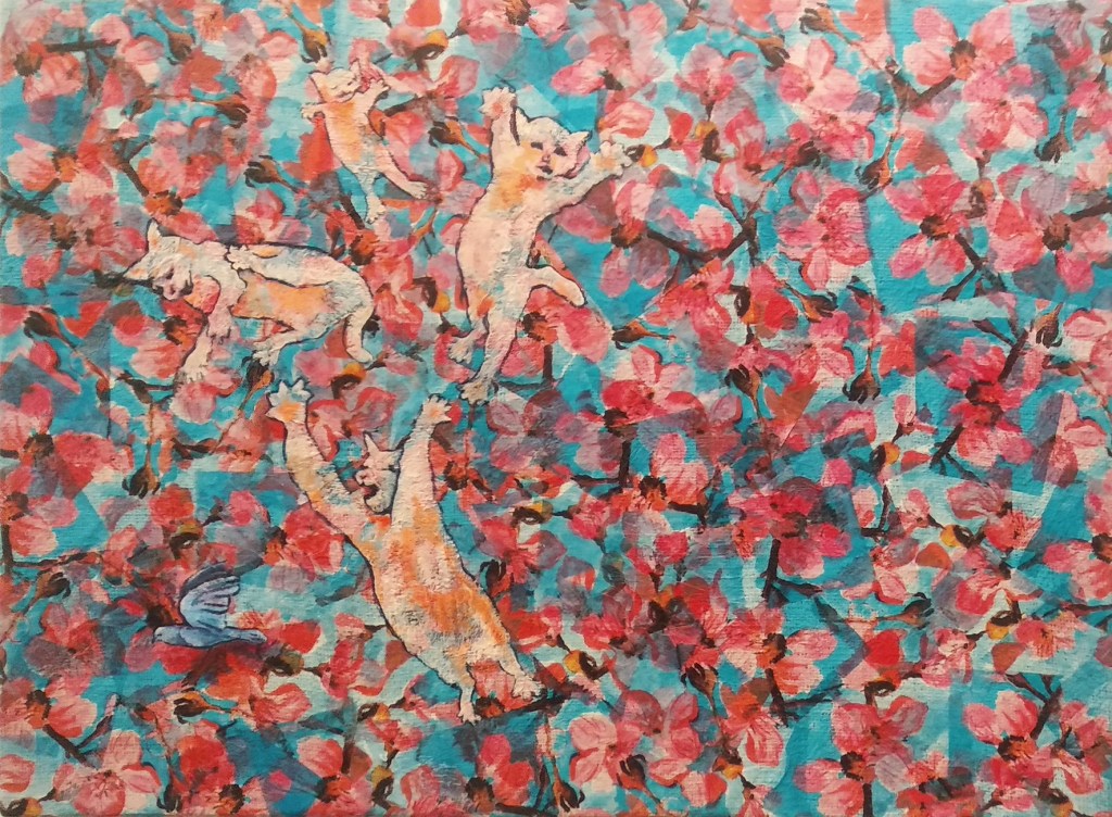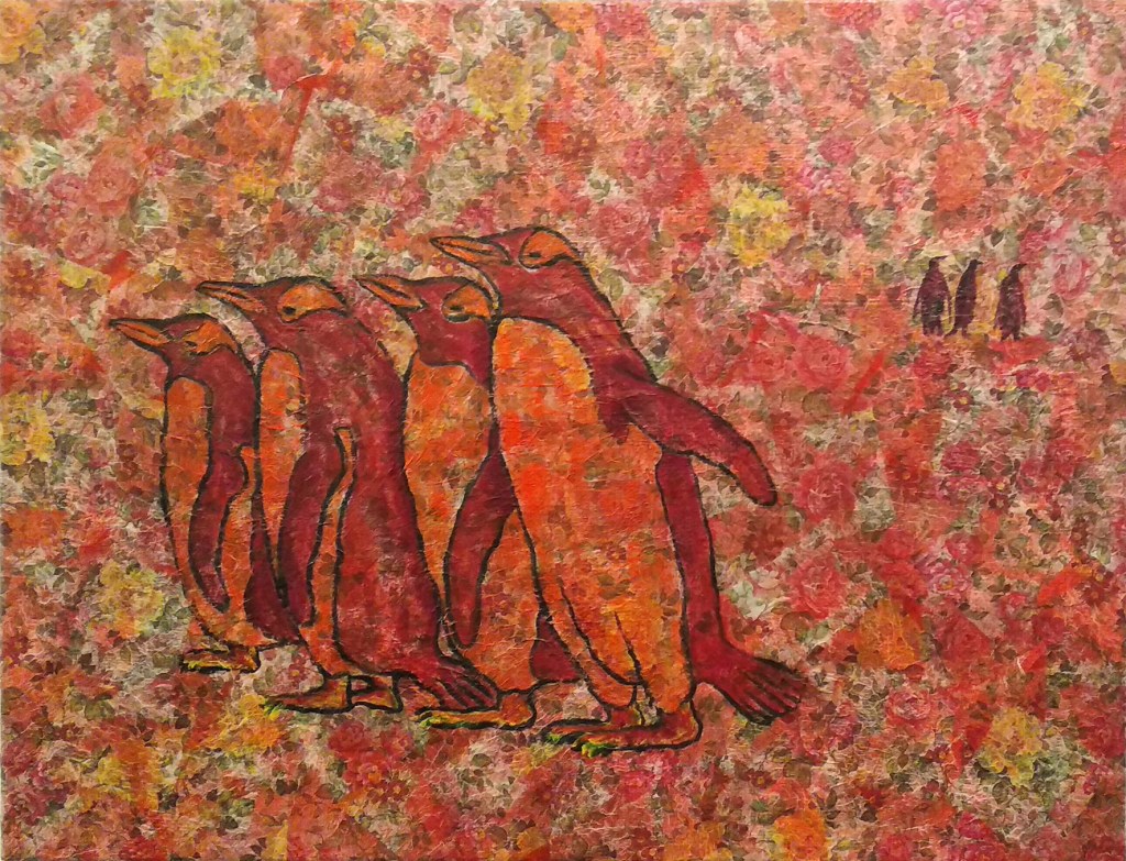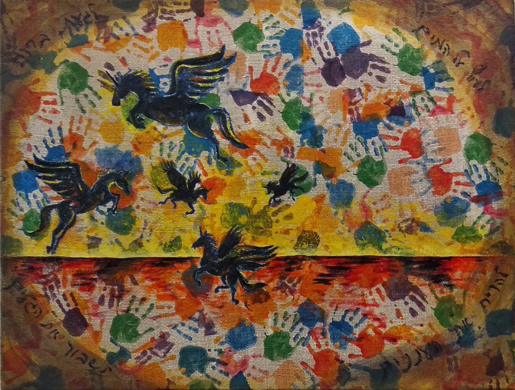 Mixed media: Paper collage and acrylic paint on jute cloth