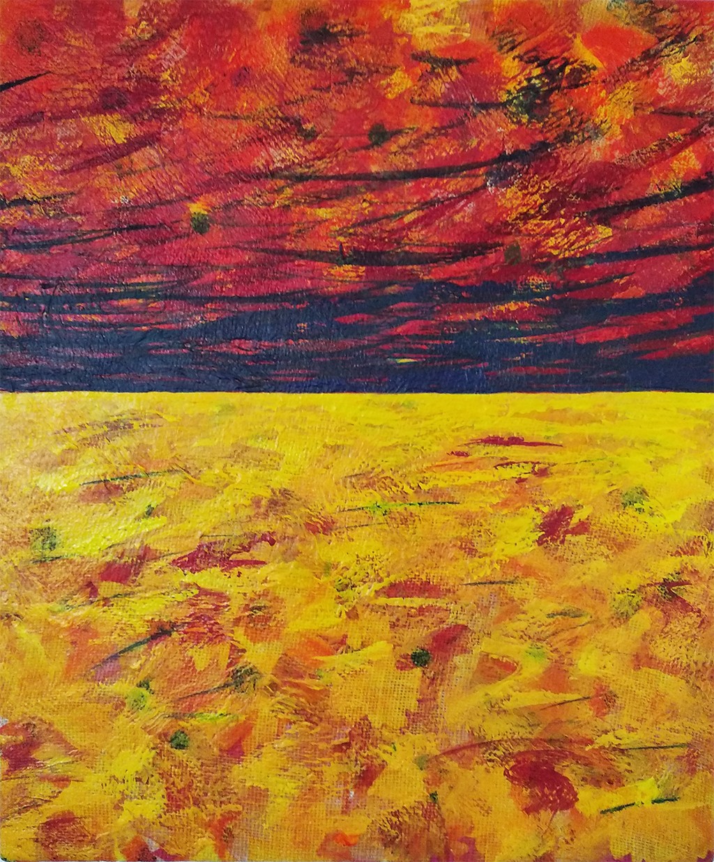 Paper collage and acrylic paint on jute cloth. 50X70cm. 2018