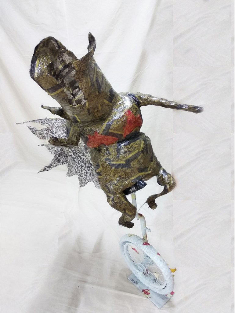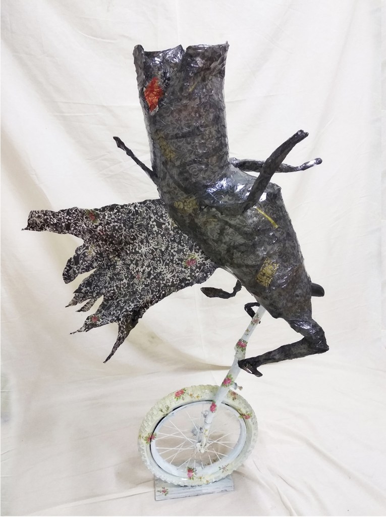 Mixed Media: Paper collage on coop net and wires, coated with transparent epoxy paint.